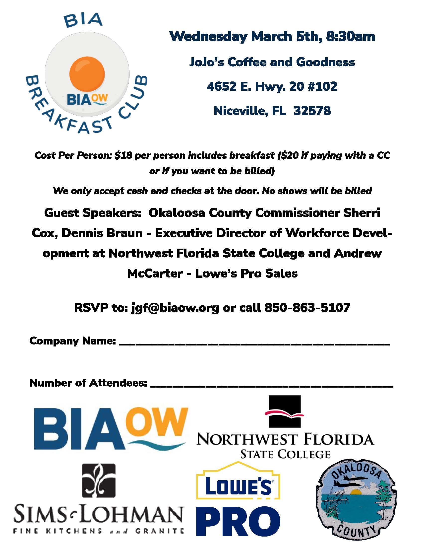 Guest Speakers: Okaloosa County Commissioner Sherri Cox, Dennis Braun - Executive Director of Workforce Development at Northwest Florida State College and Andrew McCarter - Lowe’s Pro Sales