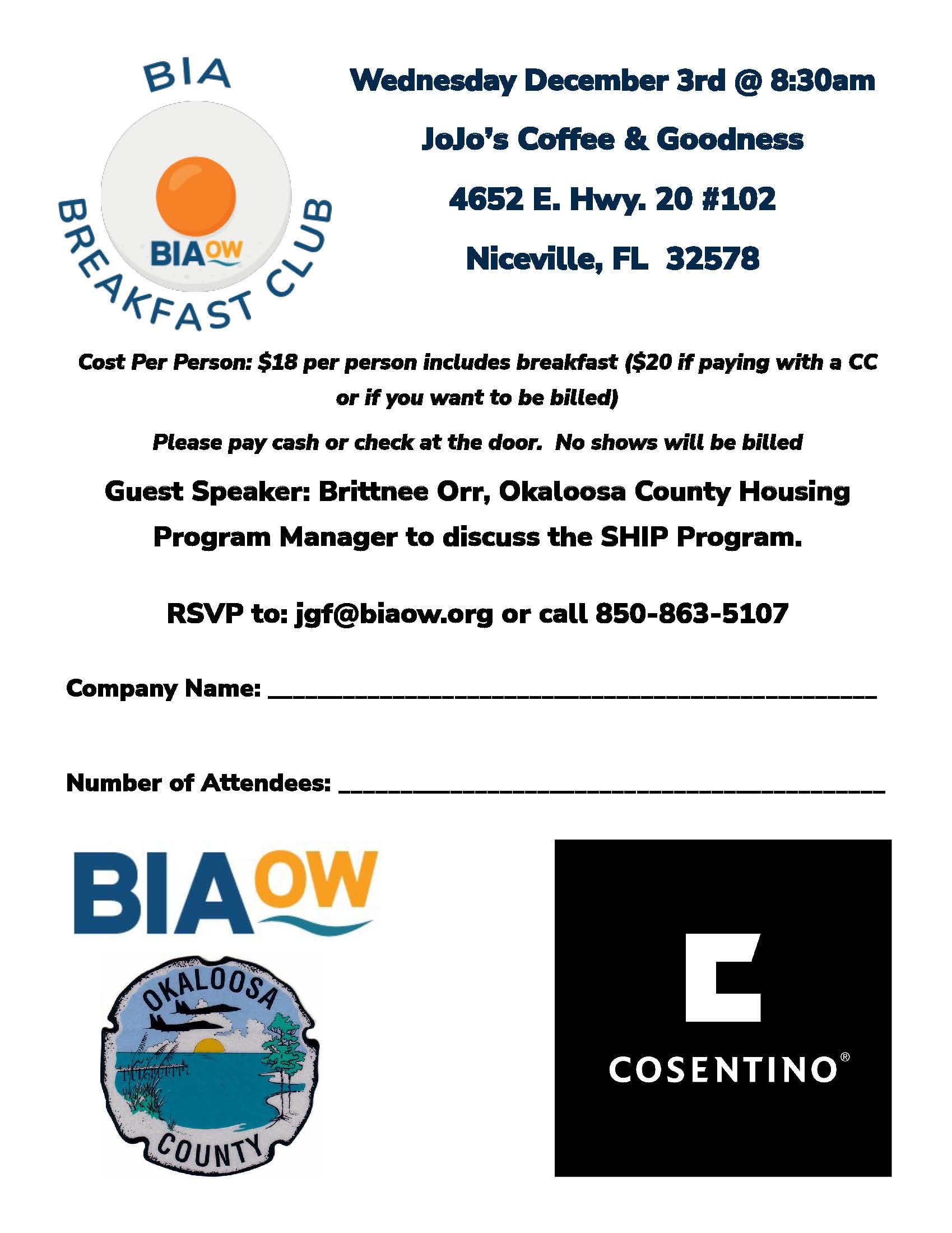 Cost Per Person: $18 per person includes breakfast ($20 if paying with a CC or if you want to be billed) Guest Speaker: Brittnee Orr, Okaloosa County Housing Program Manager to discuss the SHIP Program.Images