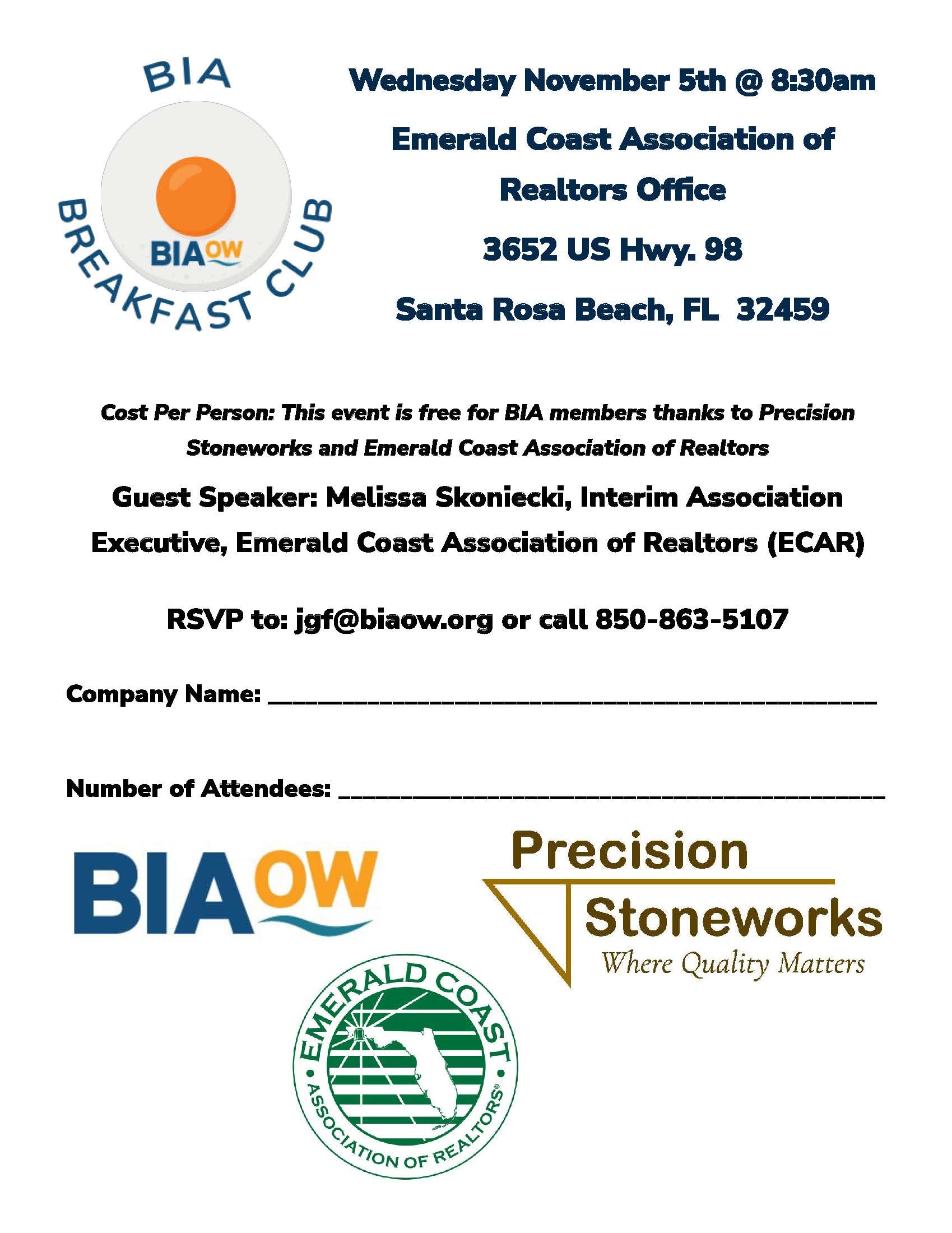 Start your morning with good coffee, great company, and a little industry insight! Join us for our next BIA Breakfast Club, featuring guest speaker Melissa Skoniecki, Interim Association Executive of the Emerald Coast Association of Realtors. Melissa will share updates and perspectives from the real estate side of our industry that every builder and associate should hear. 📅 Wednesday, November 5th ⏰ 8:30 AM 💰 FREE for BIA Members 📍 ECAOR's Santa Rosa Beach office Thank you to Precision Stoneworks and ECAOR for sponsoring this event and making it free for our members to attend!